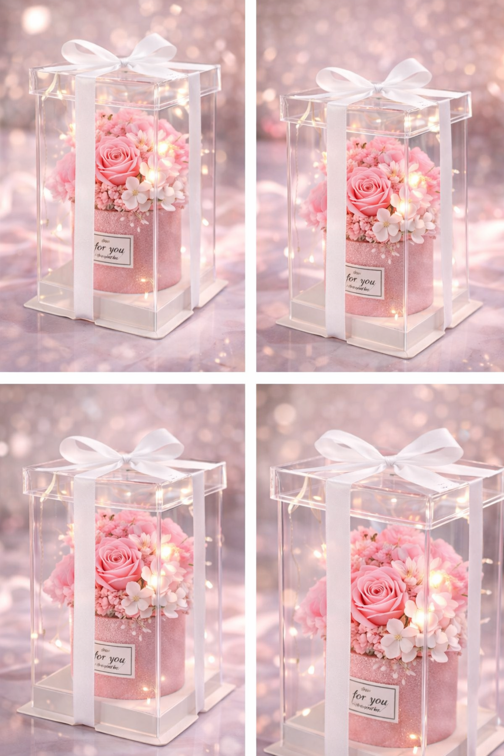 Questo vaso di fiori di sapone profumati è racchiuso in una scatola decorativa trasparente, impreziosita da un fiocco raffinato e da luci LED che valorizzano ogni dettaglio.