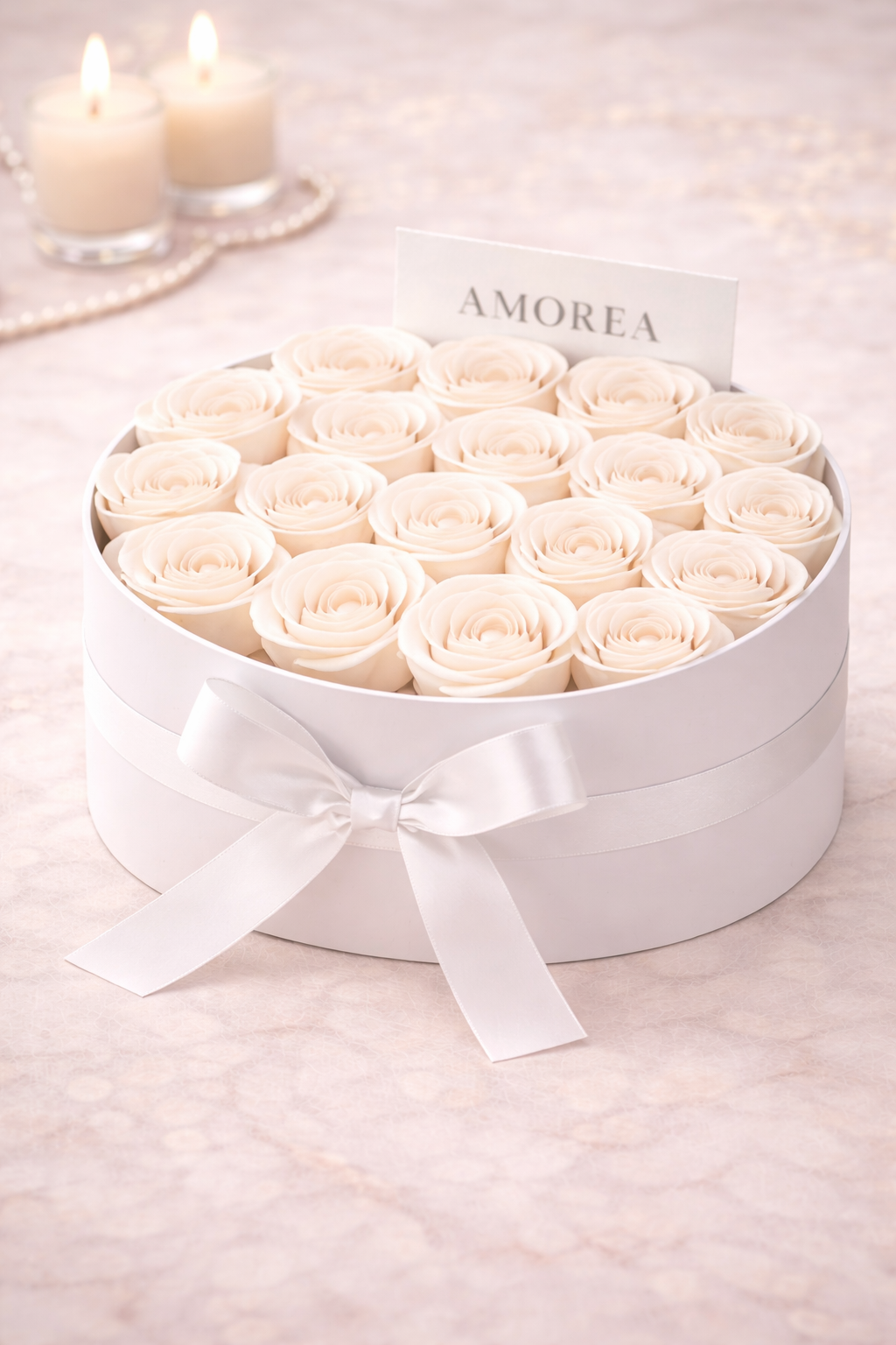 Un box elegante con rose in sapone dal colore puro, pensato come regalo pronto, raffinato e senza pensieri.